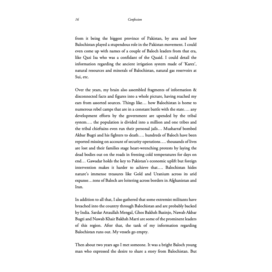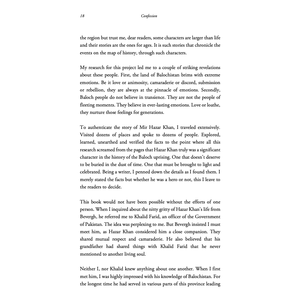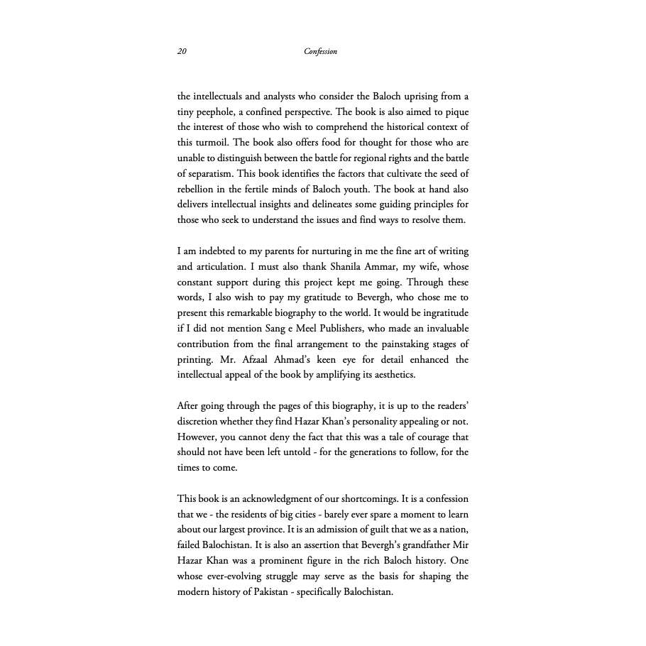 This book is an acknowledgment of our shortcomings. It is a confession that we - the residents of big cities - barely ever spare a moment to learn about our largest province. It is an admission of guilt that we as a nation, failed Balochistan. It is also an assertion that Bevergh’s grandfather Mir Hazar Khan was a prominent figure in the rich Baloch history. One whose ever-evolving struggle may serve as the basis for shaping the modern history of Pakistan - specifically Balochistan.