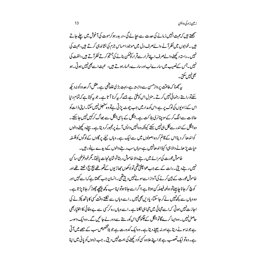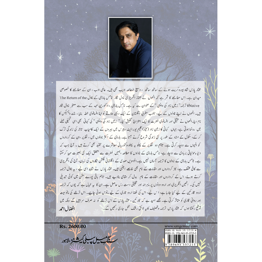 کا ترجمہ ” زمیں زاد کی واپسی “ کے عنوان سے کیا ہے۔ ٹامس ہارڈی ، وکٹورین عہد کے سب سے معتبر ناول نگار ہیں۔ انھوں نے اپنے ناولوں کے لیے، جنوب مغربی انگلستان کے ایک دیہی علاقے کو اپنا افسانوی خطہ بنایا ، جسے ویسیکس کا نام دیا۔ انھوں نے حقیقی اور افسانوی فطرت کا ایک امتزاج تخلیق کیا۔ ” زمیں زاد کی واپسی “ کی کہانی بھی اسی تخیلی خطے میں رونما ہوتی ہے، جہاں کہانی کا زمین زاد ( نیٹو) کلیم یو برائیٹ ، پیرس میں ہیروں کے ایک کامیاب تاجر کی زندگی ترک کر کے، سکول کے استاد کے طور پر نئی زندگی شروع کرنے آتا ہے۔ ہارڈی کے اکثر ناولوں میں ، تقدیر ، ان کے کرداروں کو المیوں سے دوچار کرتی ہے۔ تاہم وہ تقدیر کے پہلو بہ پہلو، وکٹوریائی معاشرے پر تنقید بھی کرتے ہیں ۔ آج جب کہ دنیا ماحولیاتی بربادی سے دوچار ہے، ٹامس ہارڈی کے ناولوں کا مطالعہ ، ہمیں فطرت سے متعلق ایک نئی بصیرت مہیا کر سکتا ہے۔ ٹامس ہارڈی کے ناولوں کا ترجمہ آسان نہیں ہے۔ انیسویں صدی کے انگلستانی فکشن نگاروں کی زبان، آج کی انگریزی سے کافی مختلف ہے، نیز کرداروں اور مقامات کے نام بھی خاصے اجنبی ہیں۔ مختار پارس نے شاید اسی لیے ، یہ ناول ترجمہ کرتے ہوئے، اس کے کرداروں اور مقامات کے نام بدل کر مقامی بنادیے ہیں۔ تاہم باقی پورے متن میں کوئی تبدیلی نہیں کی۔ انھیں انگریزی اور اردو دونوں پر ماہرانہ اور تخلیقی دست رس حاصل ہے۔ ان کا یہ خیال ہے کہ چوں کہ ترجمہ اردو قارئین کے لیے کیا جا رہا ہے، اس لیے، اس کی فضا اردو قاری کے لیے مانوس ہونی چاہیے۔ اس ترجمے کی مانوسیت اور روانی قاری کو متاثر کرتی ہے۔ مجھے امید ہے کہ قارئین ، مختار پارس کے اس ترجمے کو نہ صرف سراہیں گے ، بلکہ میں توقع رکھتا ہوں کہ مختار پارس ترجمہ و تصنیف کا یہ لائق رشک عمل جاری رکھیں گے۔